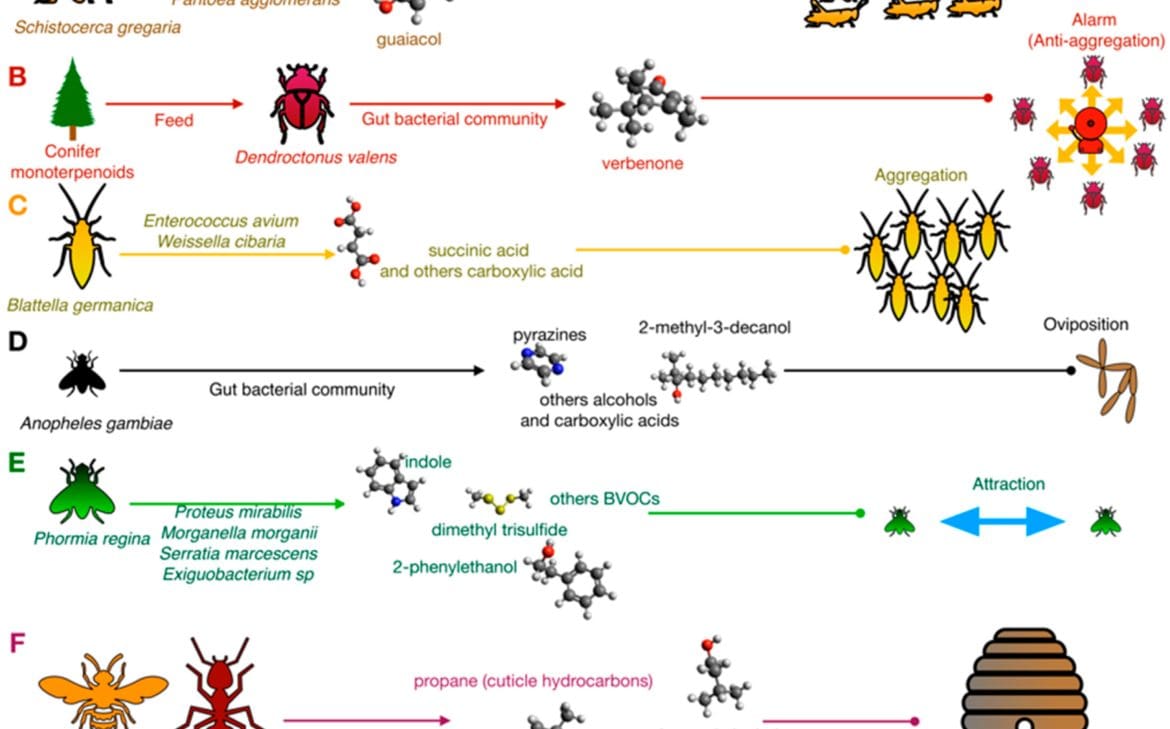 Pheromones are substances produced as messengers that affect the behavior of other insects, animals and members of the same species. In order to engage in routine activities, each species of insects relies on more than one hundred chemicals during its life. Pheromones can be mainly divided into the following species in function: trace pheromones (to locate a food source), aggregation pheromones (to find individuals of the same species), alarm pheromones (to warn any sort of danger) and sex pheromones (to attract adults of the opposite sex for mating). Simple insect pheromones are straight chain compounds, including hydrocarbon, alcohol, and esterandaldehyde. Others are side chain compounds. In addition, ketones and epoxy compounds are also included. For example, alarm pheromones always possess the structure of aldehyde and highly unstable hydrocarbons.